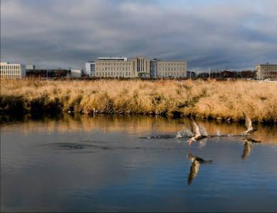 Hauptgebäude der Universität. Vom Stil her eher schlicht. Auf der Wiese vor dem Hauptgebäude haben die Gänse leider zu viele ihrer Hinterlassenschaften verloren. In unmittelbarer Nähe wird zur Zeit stark gebaut und der angrenzende Park ist wegen der Vogelbrustsaison leider gesperrt.